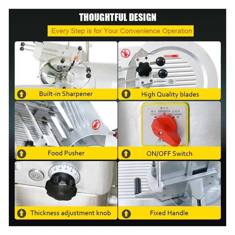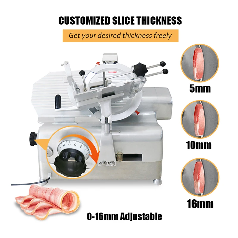 The slicer’s adjustable cutting thickness offers flexibility for different slicing needs, ranging from 0.2mm to 12mm. Whether you’re slicing thin cuts of prosciutto, thicker slices of roast beef, or even frozen meat, the JK-320 allows you to customize the slice thickness to achieve the perfect result every time. This flexibility makes it suitable for a variety of applications, including delis, restaurants, butcher shops, and home kitchens.